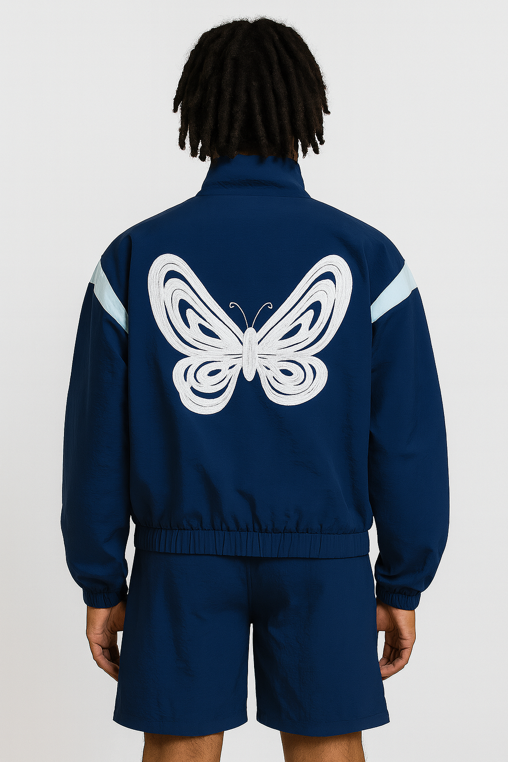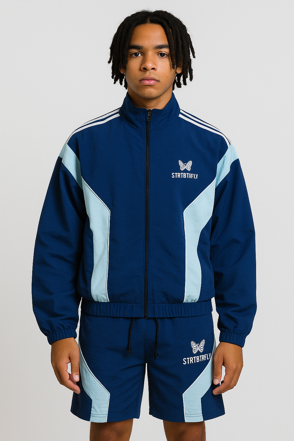 Embroidered StrtBtrfly logo on jacket + shorts